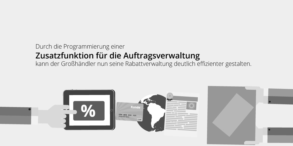 Unsere Lösung: Durch die Programmierung einer Zusatzfunktion für die Auftragsverwaltung kann der Großhändler nun seine Rabattverwaltung deutlich effizienter gestalten. Hierzu müssen lediglich die entsprechenden Produkte in der optimierten Artikelübersicht ausgewählt werden. Durch einen einzigen Klick erhalten anschließend alle unterschiedlichen Produkte automatisch den gewünschten Rabatt. Auch der individuelle Kundenrabatt wird sofort vorgeschlagen und kann angepasst und angewendet werden. Dieser Vorgang wurde durch unser Add-on auf fünf Klicks insgesamt optimiert!