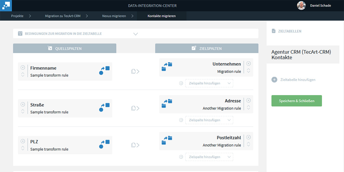 • einfache Zuordnung der Felder inklusive Transformations- und Migrationsregeln